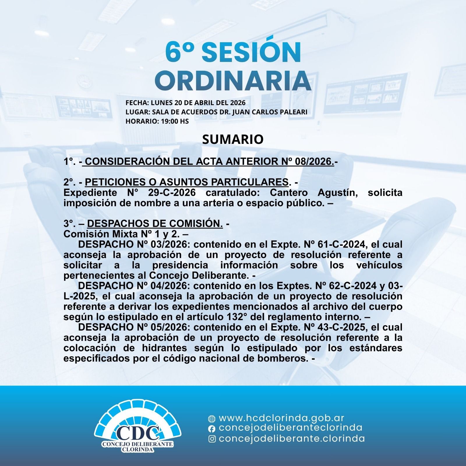 El Concejo Deliberante de Clorinda convoca a la 6° Sesión Ordinaria.