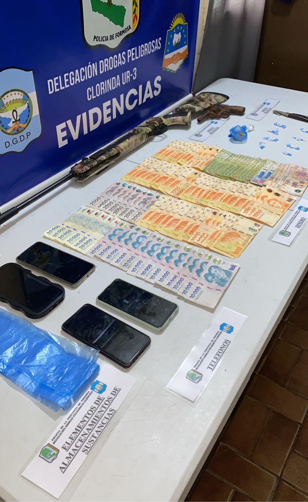 Como resultado se procedió a la detención de un joven de 24 años y al secuestro de varias fracciones de pasta base de cocaína envueltas con Polietileno, más de 300 mil pesos de dinero en efectivo, un revolver, cuatro equipos de telefonía celular, un rifle aire comprimido, restos de envoltorios (presumiblemente para el almacenamiento de sustancias), un cuchillos y un pendrive.