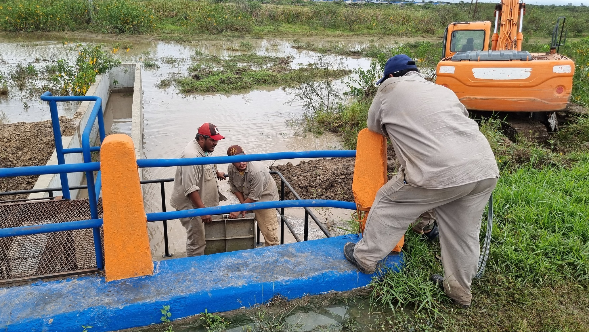 Ante esta situación, personal del SPAP junto con funcionarios municipales se trasladaron al lugar para buscar una solución rápida que evitara la entrada continua de agua proveniente de los campos. Con la ayuda de una excavadora, se taparon los accesos por donde el agua ingresaba, permitiendo así una intervención temporal para controlar el flujo.