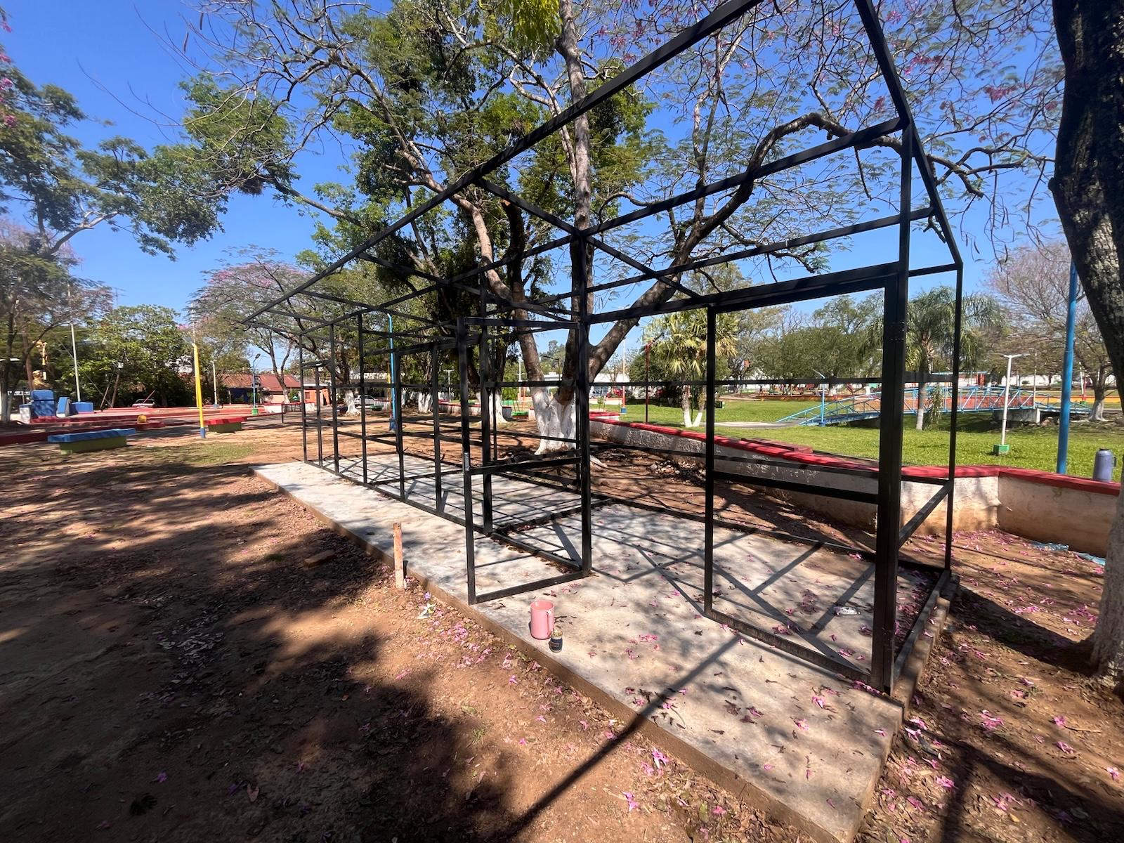 En la Plaza Güemes de Clorinda avanzan los trabajos de construcción de nuevos stands para los feriantes, con estructuras que contarán con seguridad y suministro de energía eléctrica para freezers y heladeras, asegurando la correcta conservación de frutas y verduras.