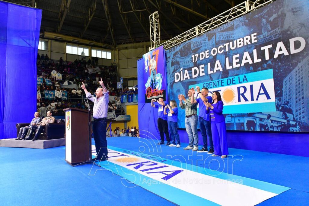 Lo acompañaron en el escenario el vicegobernador Eber Solís y los candidatos a diputados nacionales del Frente de la Victoria (FdV)-Formosa: Graciela de la Rosa, Fabián Cáceres, Mirta Retamozo y Camilo Orrabalis.