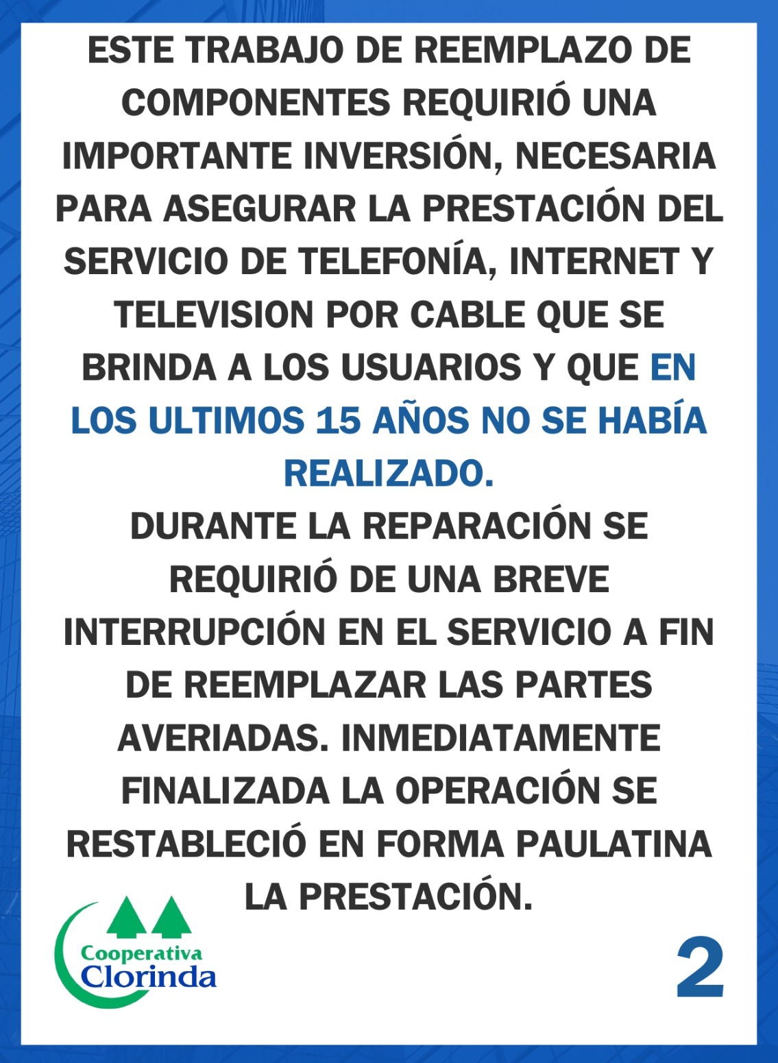El Consejo de Administración de la Cooperativa Clorinda informa sobre los trabajos realizados, por el equipo de ingenieros, a fin de mejorar los servicios.